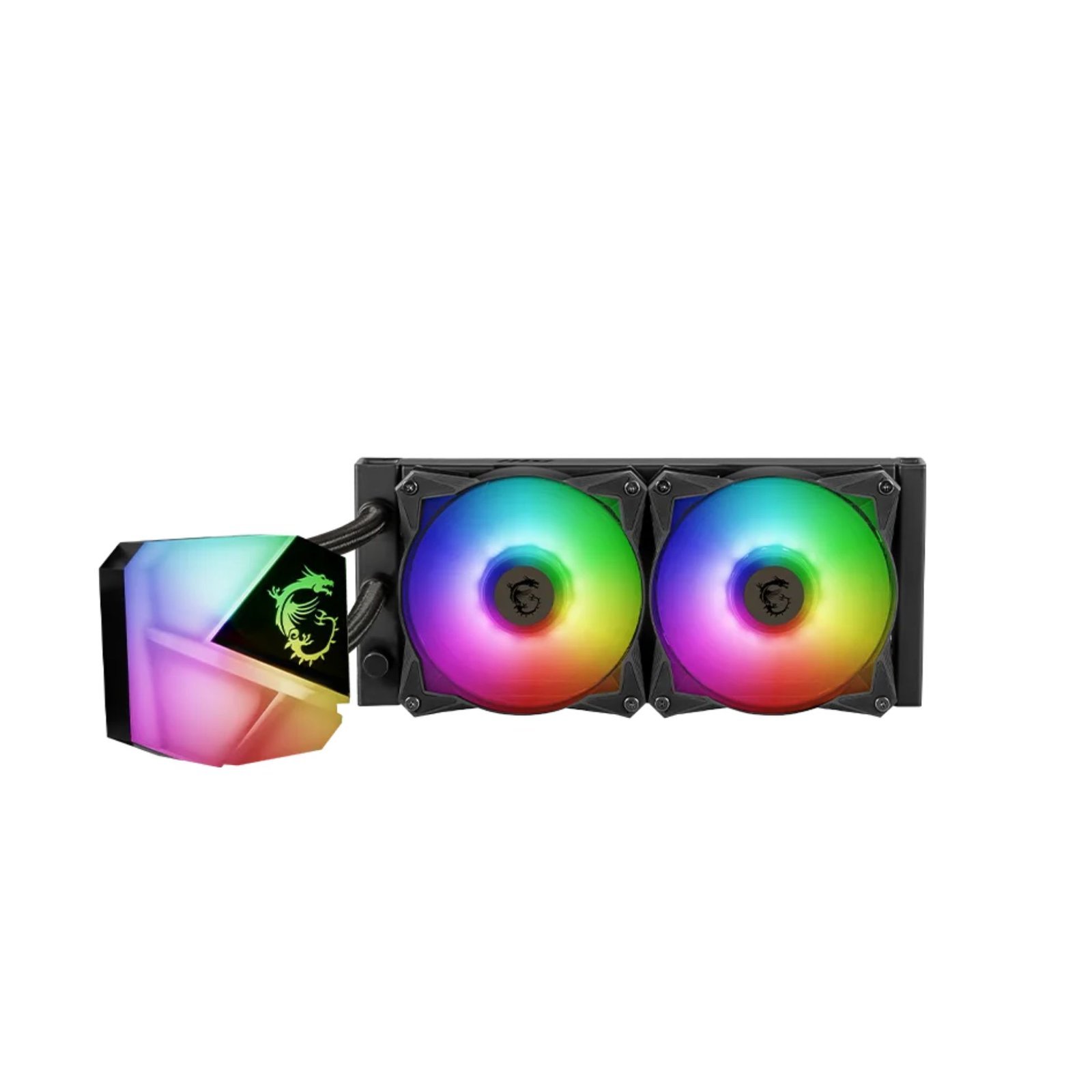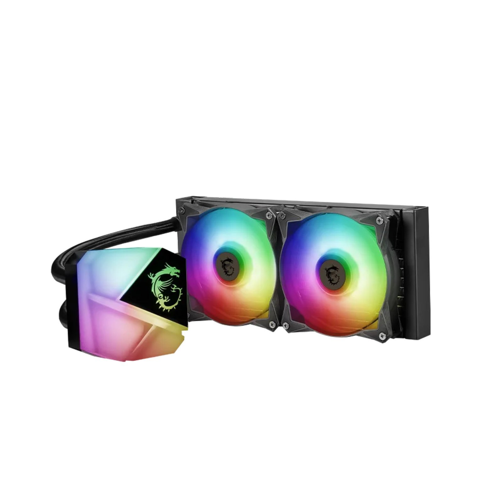 The MSI MAG CORELIQUID C240 is a 240mm ARGB liquid CPU cooler, designed for efficient cooling and stylish aesthetics. It features dual ARGB fans with speeds ranging from 500 to 2000 RPM, delivering 78.73 CFM airflow for optimal cooling performance. The two-ball bearing design enhances durability, and reinforced tubing prevents leaks for long-lasting reliability. With low noise levels (14.3 – 34.3 dBA), it offers powerful cooling with quiet operation. The ARGB lighting syncs with MSI Mystic Light, adding a vibrant touch to any gaming or workstation setup.